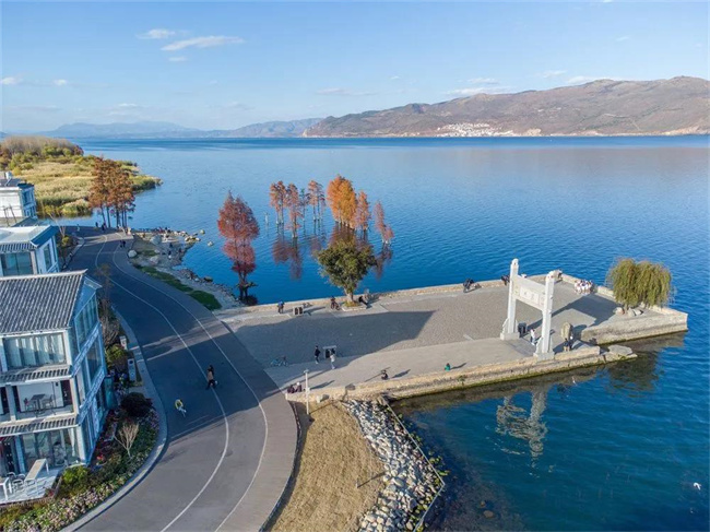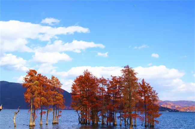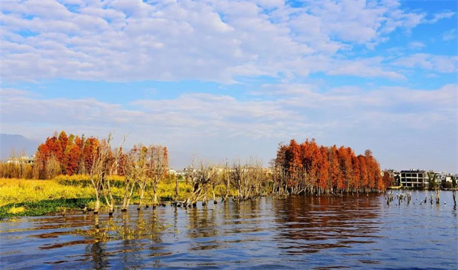 看北側(cè)洱海邊上嬌艷似火的紅杉