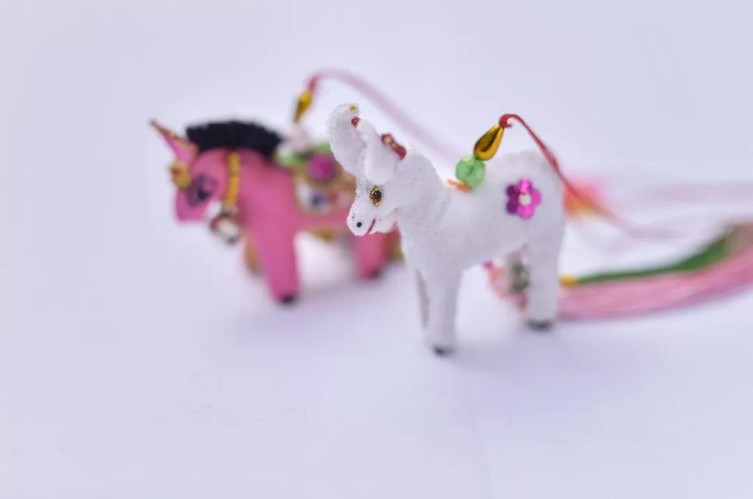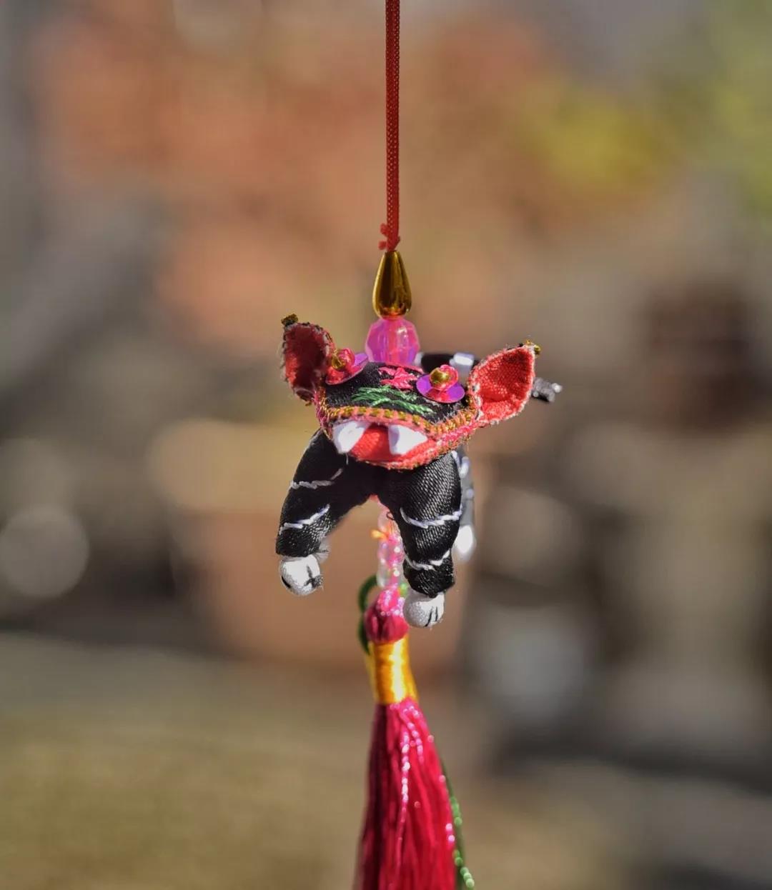 小個兒的仙鶴、蛇、老虎、金雞,飛馬……串成一串串的,定睛一看,發(fā)現(xiàn)同一只老鼠都有不同的造型,有的偏向平板,有的則十分立體。猴子的模樣也是經(jīng)過多次“改版”,包括所用的毛料、面部的造型和整體的神態(tài)都有差別,有的嘴角上揚,憨態(tài)可掬;有的則是雙手作揖,一臉機靈勁兒。