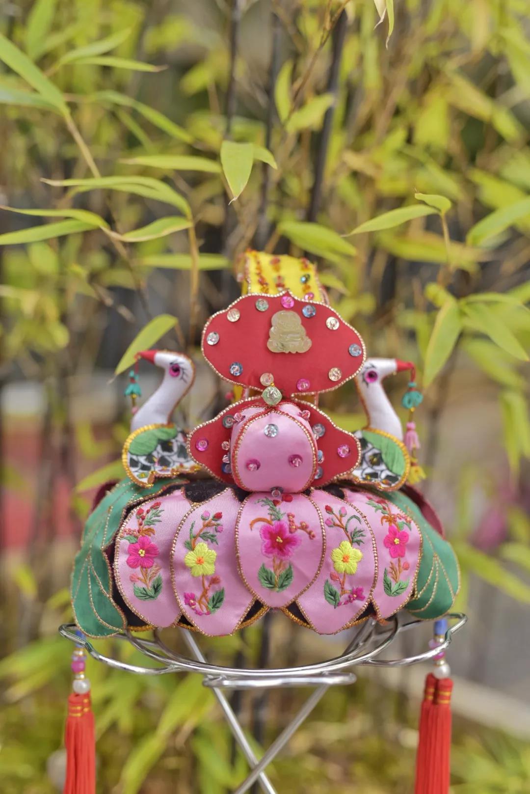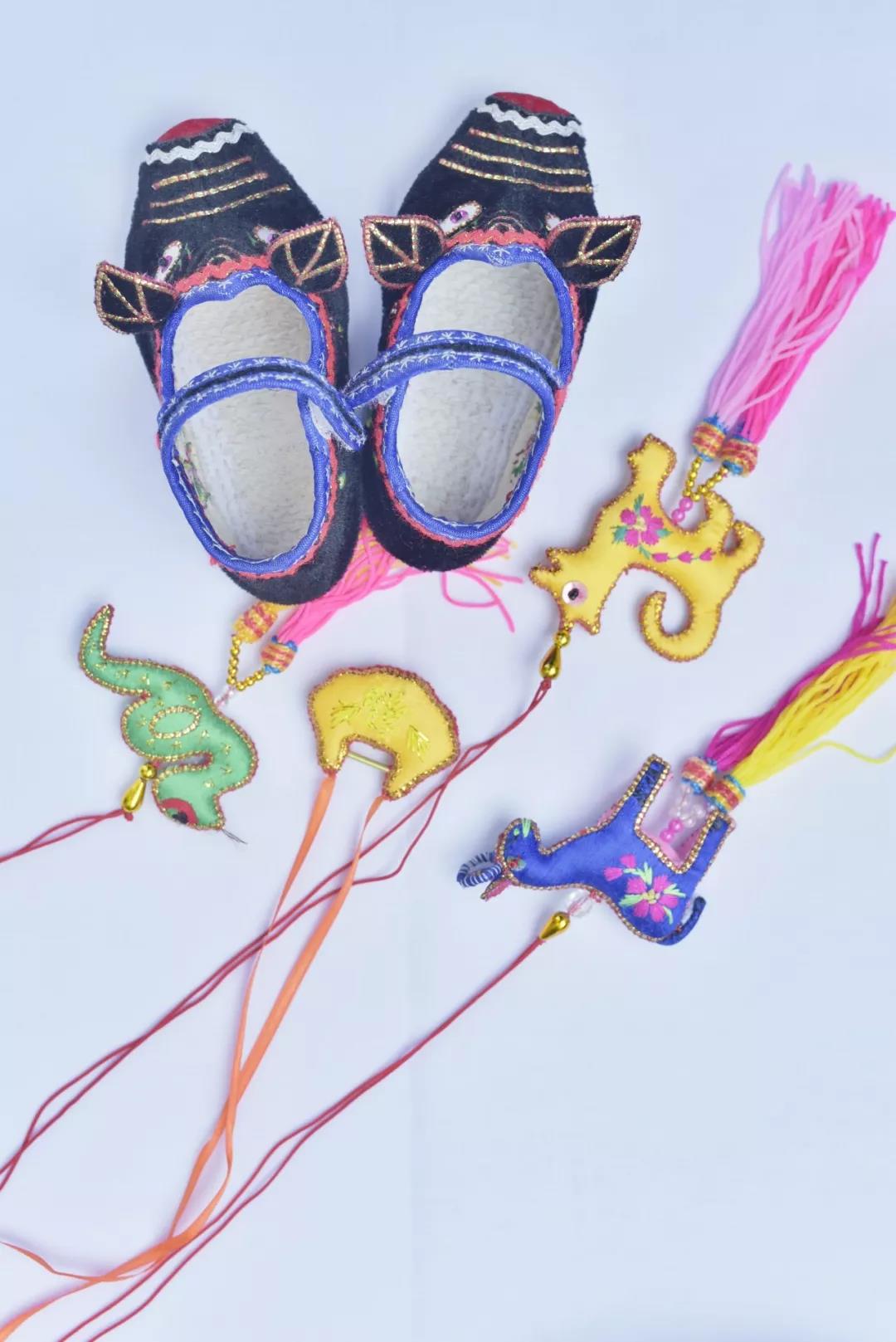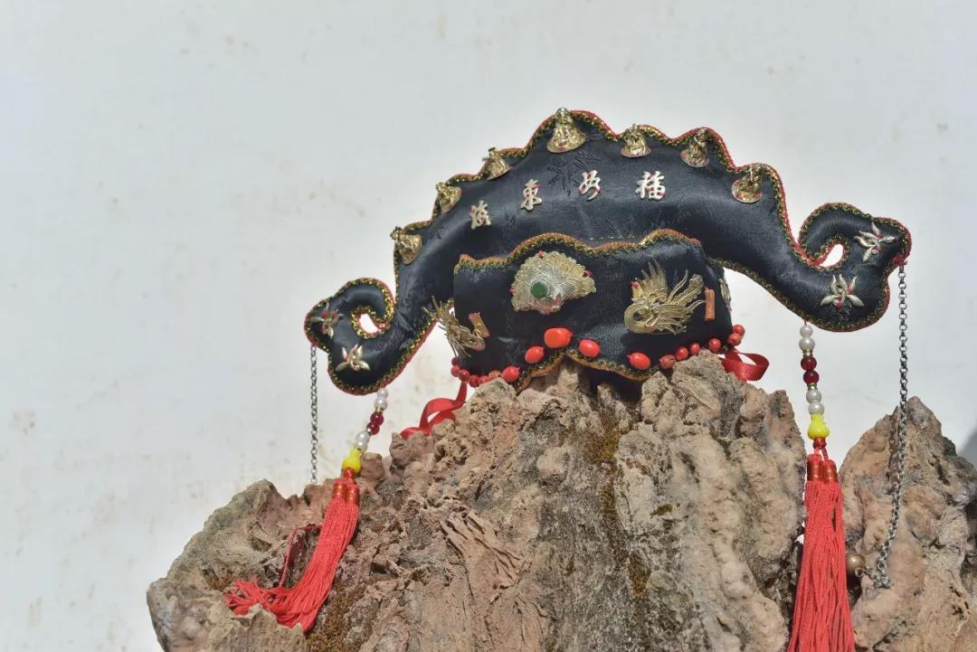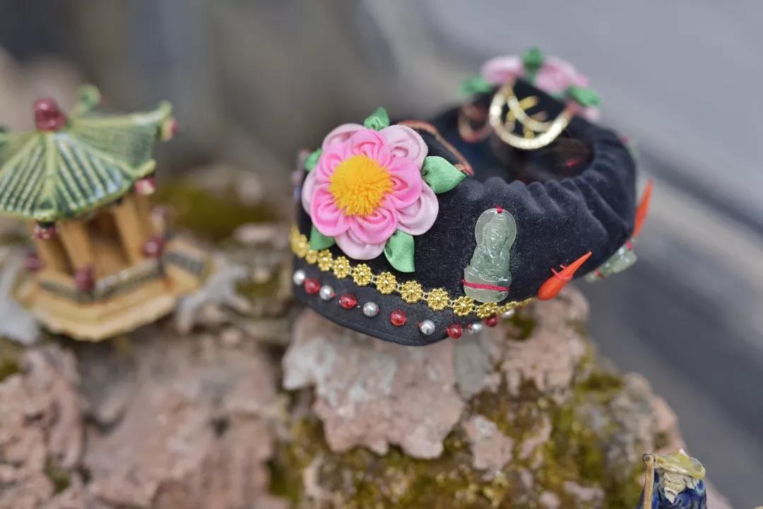 小有小的精妙,大有大的學問。除了小掛件精細別致,趙新妹做的大件帽子、嬰兒鞋也十分精美。純手工的布扎嬰兒帽將布扎與刺繡工藝結(jié)合,變換出蓮花、虎頭、狗頭等不同的形狀,再在帽子上裝飾諸如古玉、珠寶等配件,做工十分講究。趙新妹說,一頂帽子要用四五十天才能縫制好,用心程度可想而知。