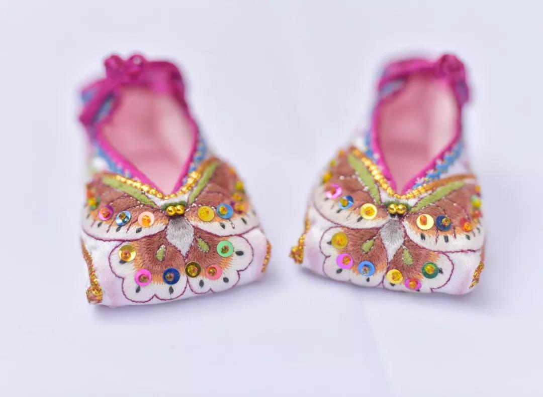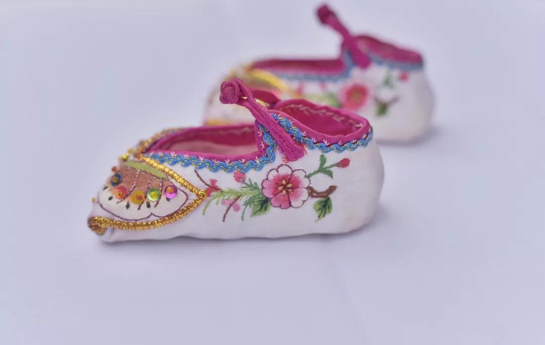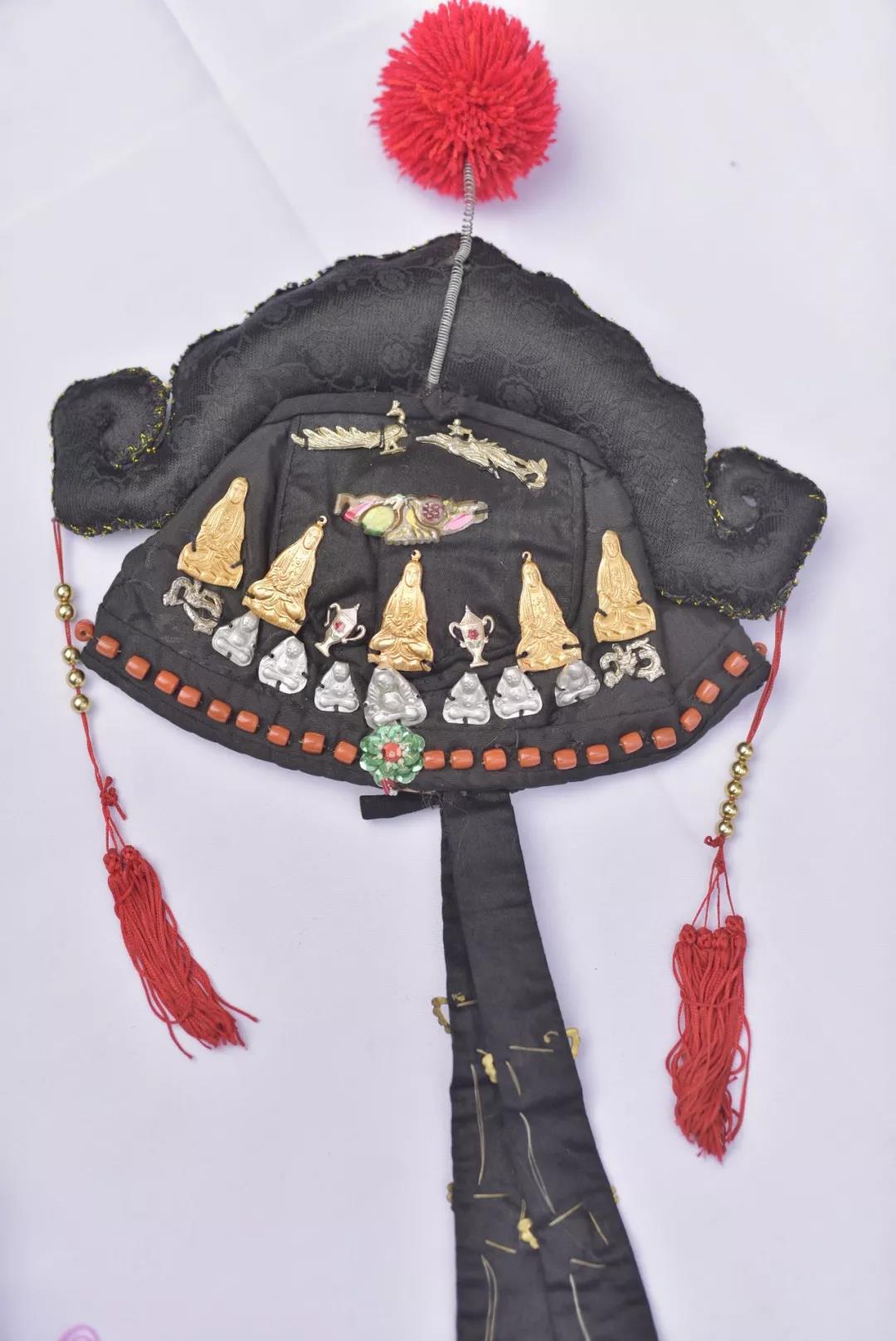 小有小的精妙,大有大的學問。除了小掛件精細別致,趙新妹做的大件帽子、嬰兒鞋也十分精美。純手工的布扎嬰兒帽將布扎與刺繡工藝結(jié)合,變換出蓮花、虎頭、狗頭等不同的形狀,再在帽子上裝飾諸如古玉、珠寶等配件,做工十分講究。趙新妹說,一頂帽子要用四五十天才能縫制好,用心程度可想而知。