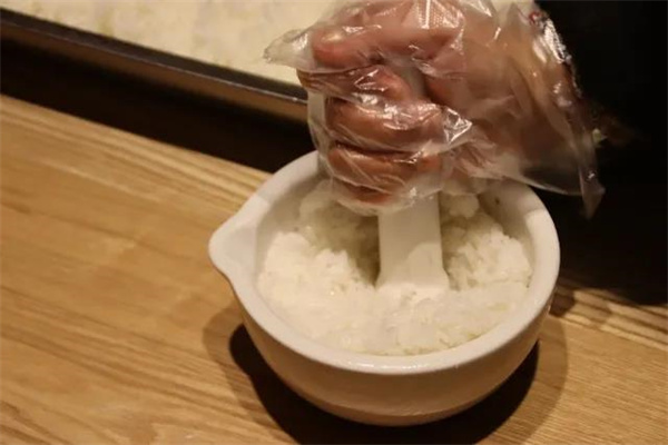 然后迅速將蒸熟的糯米倒入杵臼