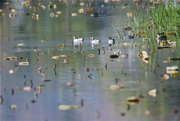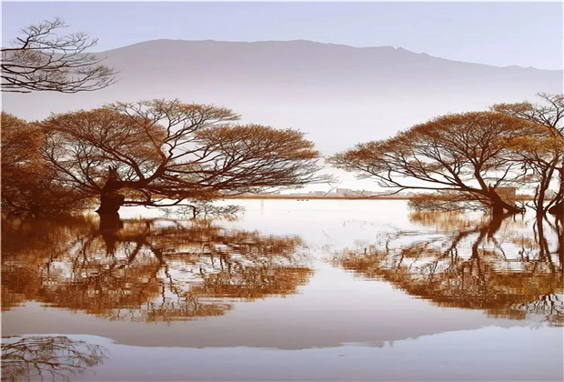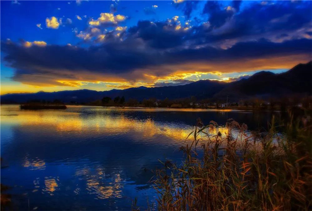 高原淡水湖泊草海濕地,位于鶴慶壩子中間。草海水域通過小溪溝渠、田疇與漾弓江相連,河渠縱橫,木舟往來。“落霞與孤鶩齊飛,秋水共長天一色?!苯鹎飼r節(jié),草海濕地色彩斑斕,美如詩畫。