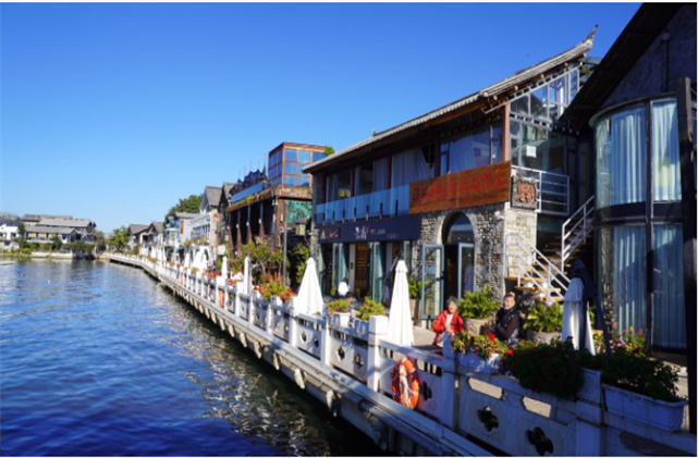 去島上的途中會看到馬路兩邊都是白族特色的房屋,這里大部分都是改造以后的民宿,所以如果選擇住在這里的話也很方便,除此之外,這兩邊的特色店鋪也很多,不管是當(dāng)?shù)靥禺a(chǎn),還是咖啡、茶館,樣樣俱全。