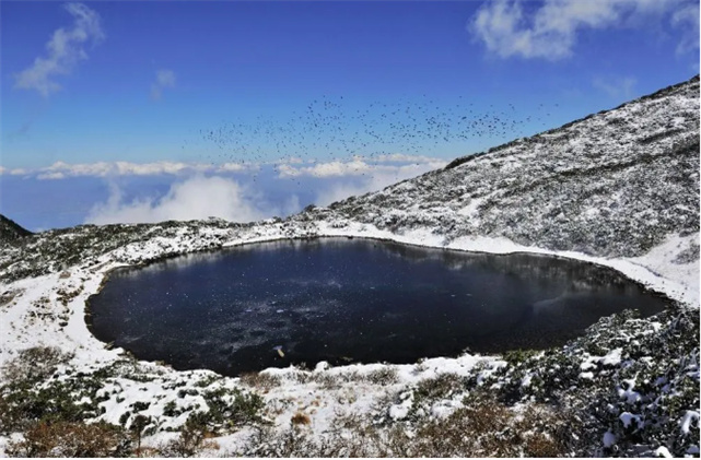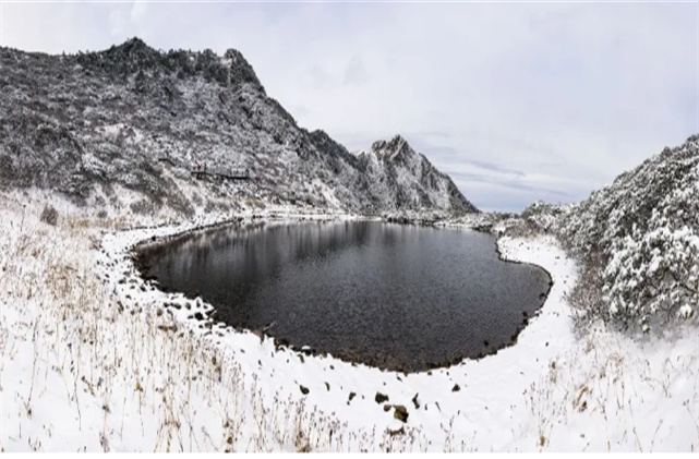 冬日的洗馬潭被雪花這個調皮的“小孩”把潭邊圍了個遍撒著歡兒地唱著冬天的歌謠。
