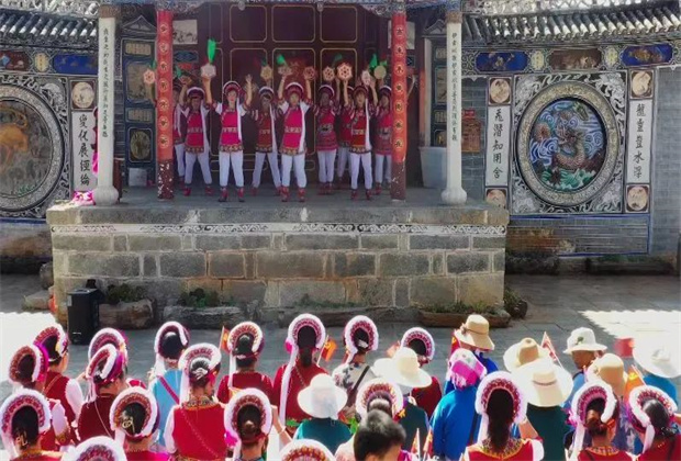 現(xiàn)在這個(gè)戲臺(tái)仍然在使用,美麗的白族金花們?cè)趹蚺_(tái)上伴著大本曲跳著舞。戲臺(tái)不遠(yuǎn)處,有一棵百年樹齡的大榕樹,