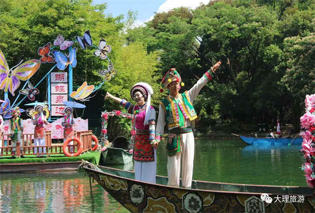 “蝴蝶泉邊·蝴蝶會”期間,在蝴蝶泉邊、情人湖邊、竹林道等位置,由景區(qū)舞蹈演員帶領(lǐng)游客朋友一同開展歡歌打
