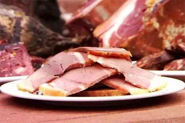 諾鄧有著千年歷史的天然井鹽,諾鄧火腿制作技藝歷史悠久,獨特的地理氣候,再加上當地人精細的手工腌制技藝,造就了諾鄧火腿獨具的美味。在《舌尖上的中國》短短出鏡,使產自深山的諾鄧火腿一夜間蜚聲全國,無數人對它垂涎不已。諾鄧火腿肉色嫩紅、咸淡適中、醇香而回味悠長,腌制三年以上的諾鄧火腿,可以直接生吃,鮮香而不咸,肥嫩而不膩。
