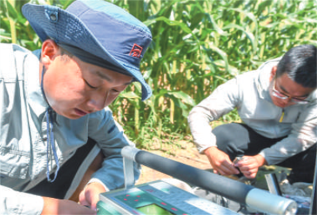 沙野(右)和同學(xué)在試驗(yàn)田里組裝光合作用測(cè)量系統(tǒng)。張楠 攝
