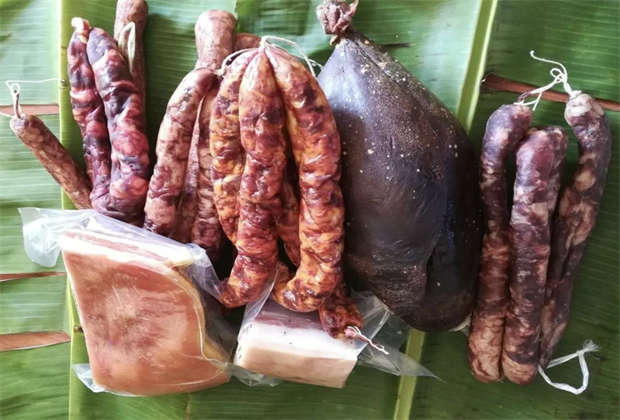 ? ? ?鶴慶臘腸的香醇不用多說,但鶴慶里脊肉腸是需要大說特說的。鶴慶把里脊臘腸稱為里肉(讀“入”),是把一條完整的豬里脊灌入豬大腸,然后裹以稻草捆扎、風(fēng)干存放。