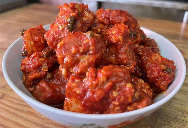 ? ? ? 雖然帶了個肝字,但卻與豬肝無關(guān)。鶴慶做豬肝酢稱為捏豬肝酢,一個捏字凸顯了關(guān)鍵。豬肝酢以豬排、豬腸、豬肚為主料,辣椒面、鹽巴、花椒粒為輔料,主、輔料拌均后,倒入乾酒和龍?zhí)端?,反?fù)捏、拌,直到配料與主料色、味相融,呈現(xiàn)出紅生生的顏色,然后入罐壓實,最后在罐口封上一層豬油,存放一段時間即可食用,可存放一至二年,色、味不變,堪為神奇。
