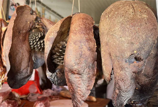 ? ? ? 吹肝是鶴慶人獨創(chuàng)的美食。腌制需要技術(shù)。取一籠完整的豬肝,用麥桿在豬肝管口不斷吹氣,邊吹邊拍打豬肝。如此反復(fù),豬肝慢慢膨脹,即灌以鹽巴、辣椒面、泉水、乾酒兌成的汁液,然后扎緊豬肝管,掛在陰涼處風(fēng)干。