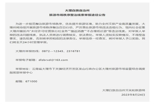 為進一步規(guī)范整治旅游市場秩序,優(yōu)化提升旅游環(huán)境,助力全州文旅產(chǎn)業(yè)高質(zhì)量發(fā)展。8月24日,大理白族自治州文化和旅游局發(fā)布大理白族自治州旅游市場秩序整治線索舉報途徑公告。對舉報人舉報的違法問題線索,執(zhí)法人員將進行調(diào)查核實,依法查處。