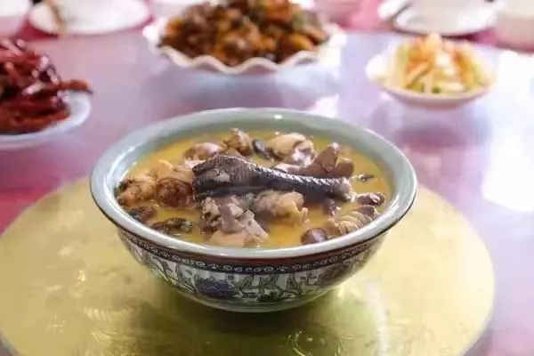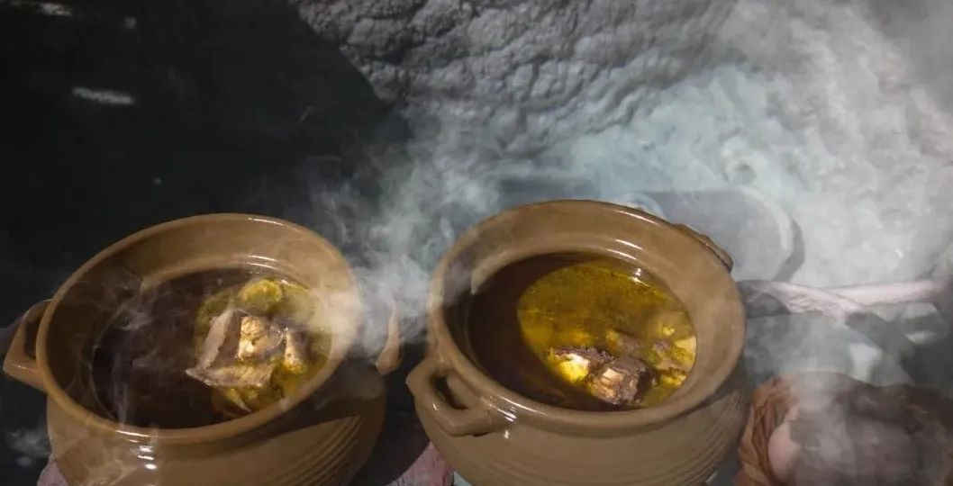 洱源山水秀美,溫泉星羅棋布,有著“溫泉之鄉(xiāng)”的美譽,這里的溫泉燉雞堪稱一絕。在制作溫泉燉雞的過程中,將雞清洗干凈后,配以鮮豬油、草果、木瓜絲、姜絲等佐料,放入陶罐中,不盛水并密封罐口,再放入硫磺泉中燉煮。隨后從泉水中取出的溫泉燉雞骨肉分離、肉質(zhì)鮮美、香味撲鼻,若加上三七、蟲草、天麻等名貴藥材燉煮,更是一道難得的滋補佳肴。