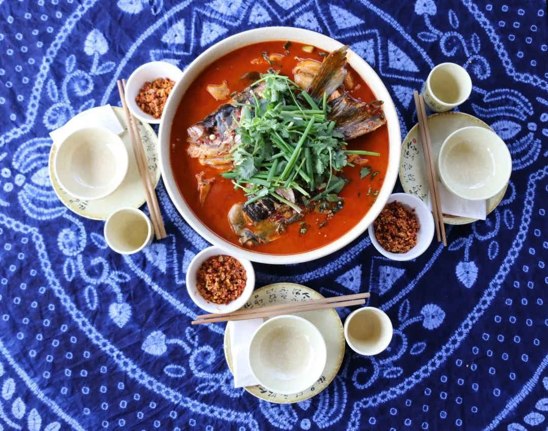 “家財萬貫不如魚湯泡飯?!痹诖罄?,幾乎家家會做酸辣魚,其味美鮮香、酸辣可口、百嘗不厭,一直以來都是白族家宴上的主角以及待客的“招牌”。大理酸辣魚以洱海鯽魚為主材,配以紅椒、青椒、木瓜、楊梅或烏梅為原料,用土灶燒柴火煮成,有時還會放入土豆和豆腐作為輔料,酸、辣、鮮、香,令人食欲大開。嘗上一口,鮮甜甘美,鮮香的魚湯用來泡飯,更是美得從胃到心里。