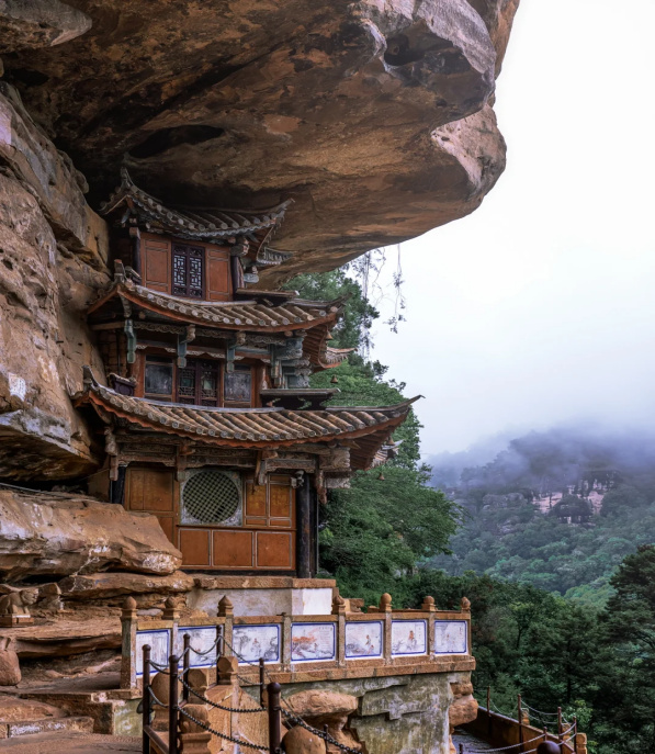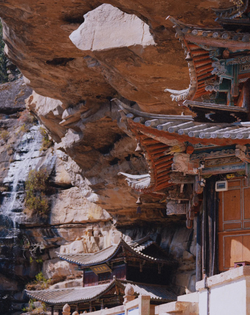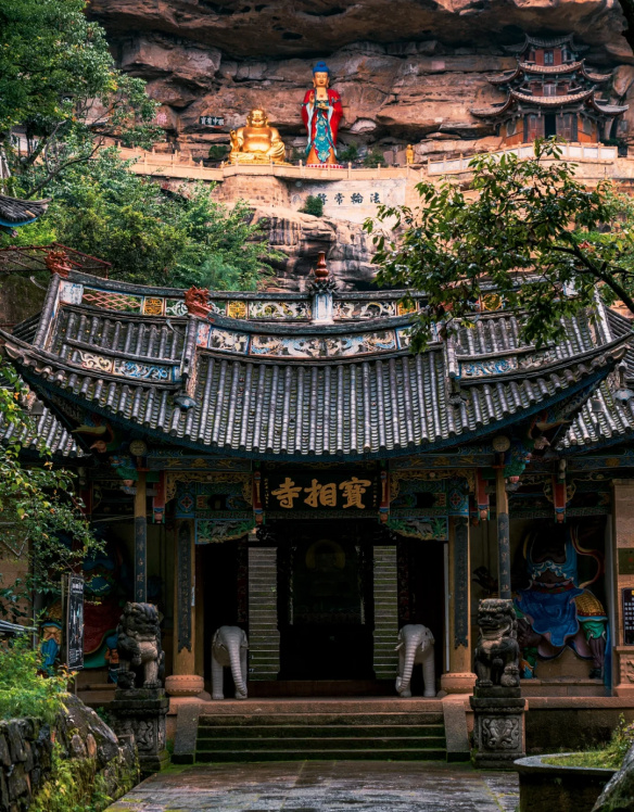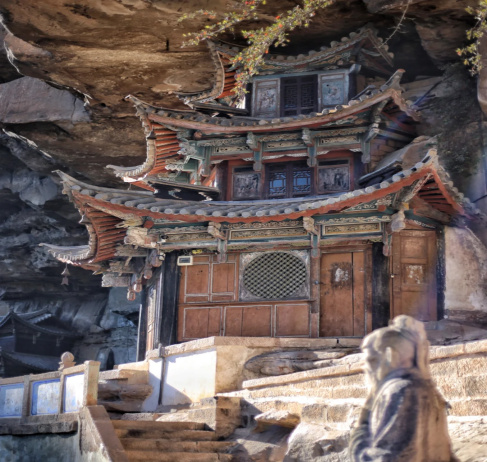 寶相寺,建在險(xiǎn)峻的懸崖上,被稱為“云南的懸空寺”,為明正統(tǒng)年間鶴慶土知府高論所建,初為道觀后來(lái)佛教興盛,除玉皇閣外大多廟宇均祭佛像,成為一個(gè)佛道合流的場(chǎng)所。