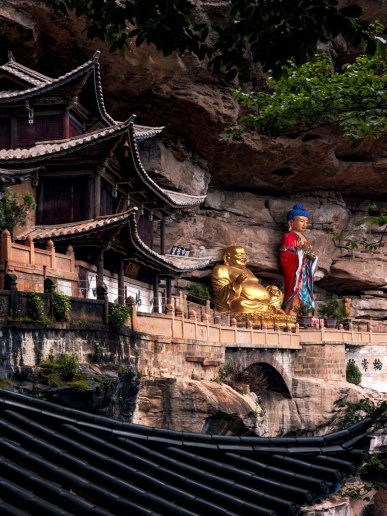 穿過(guò)小小的山門,寶相寺終于出現(xiàn),高聳著寬闊的山崖,寺廟依山勢(shì)層層抬高,貼著山崖的各個(gè)殿宇、造像在空中嵌入崖壁,這便是寶相寺最吸引人的懸空奇景。殿宇之間彌勒、如來(lái)兩尊巨大的造像屹立著,氣勢(shì)雄偉。