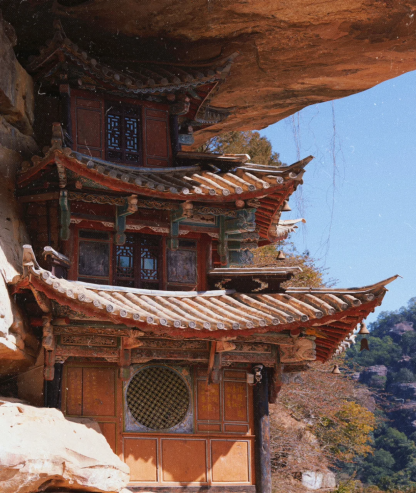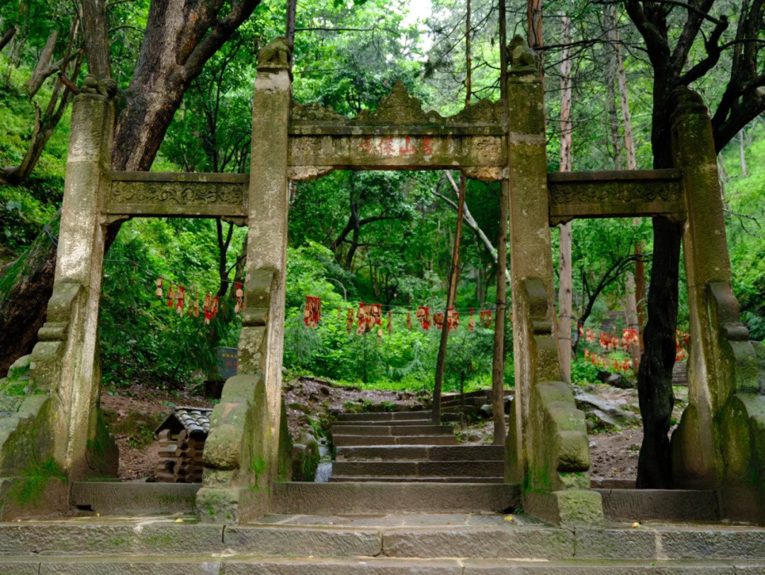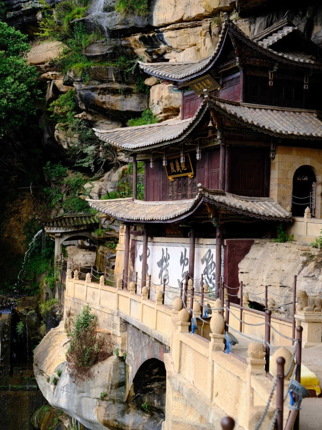 山崖間有瀑布飛下,好似白色水簾一般。古人人性化地在瀑布崖壁上建造了有頂?shù)拈L(zhǎng)廊,在長(zhǎng)廊里透過(guò)“水簾洞”俯瞰寶相寺,整個(gè)寺廟更似人間仙境。