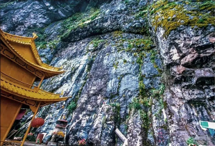 華首門是雞足山最神圣的地方,迦葉尊者就在這里“守衣入定,待佛降生”?!叭A”通“花”,華首門意為第一個領悟佛祖拈花深意的人入定處的大門,是雞足山佛教文化的源頭,風光險峻奇絕聞名中外。華首門鑲嵌在筆直如刀削、下臨萬丈深淵的舍身崖絕壁之上。高40米,寬20米,上部圓形石崖突出近3米,中有一道垂直下裂的石縫,將石門分為兩扇,門縫上半部懸巨石“大鎖”一把,將華首門緊緊鎖住,門楣、檐口清晰可辨。游人至此,仰觀絕壁,危崖萬仞,直摩蒼穹,怪石磷峋,搖搖欲墜,猴不敢攀,鳥不敢過;俯瞰幽谷萬丈,深不見底,云蕩霧起,若立九霄。歷代名士高僧到這里,無不嘆為觀止,因此有“朝山不到華首門,枉為世間修行人”的說法。現(xiàn)在還留有民國時期留下的“峻極于天”及 “迦葉尊者入定處”等石刻。