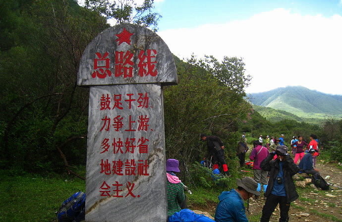 第一天20公里,喜洲文革村山口開始徒步,約1.5小時(shí)到達(dá)埡口,埡口邊有些工棚,有山泉水,可在此休息,埡口過有個(gè)岔路口,右邊是修好的土工路,請(qǐng)往左邊的山路走,約4小時(shí)可到達(dá)社會(huì)主義總路線路碑,之后3小時(shí)是平坦的大花甸地區(qū),順著已經(jīng)沖毀的公路痕跡一直往前走,7小時(shí)左右到花甸壩藥材場(chǎng),記得是過一個(gè)小橋,有村莊感覺的地方,因?yàn)榉孔訉?shí)在太少,所以不要走過了.