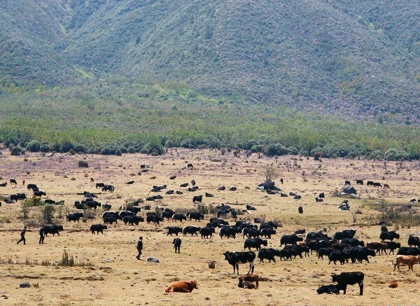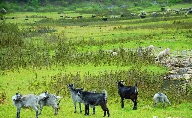 在這個(gè)高山草場(chǎng)里,成群結(jié)隊(duì)的黃牛、牦牛、綿羊和三三兩兩的馬兒,在悠哉的吃草、追逐、戀愛,或者躺著曬太陽,很是自在。