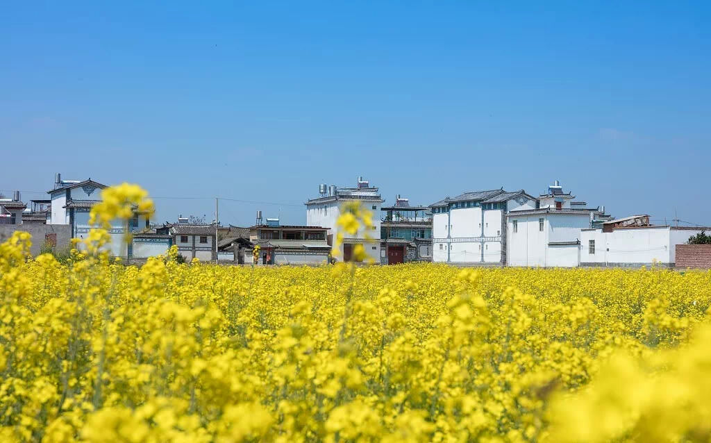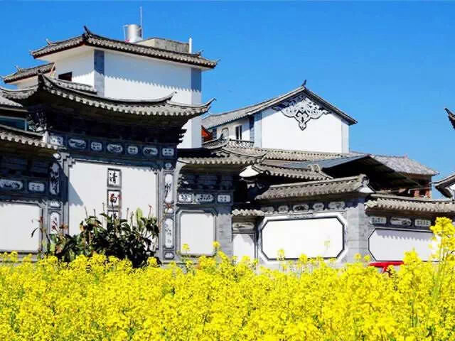 陽光正好,春風(fēng)拂過,大片的油菜花在藍(lán)天白云之下掀出一陣陣金色的波浪,與周圍錯落的白族古建筑群相得益彰,將春天的深情在這里灌溉。給這個(gè)隱秘的古鎮(zhèn)增添了一份恬靜、一份安寧、一份祥和。