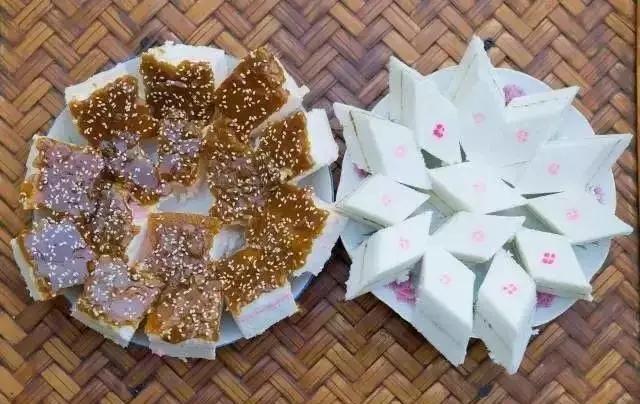 鶴慶米糕,制作精細(xì),分干糕和水糕兩大類。干糕,又以喜慶干糕為上品,喜慶干糕又分夾層糕和色糕兩種。夾層糕呈菱形,比普通干糕稍厚略大,中有紅糖、薄荷、橙皮、棗泥、龍眼的混合夾層;色糕呈正方形,中間有紅色腰線,表面為紅色罩面,紅白分明,質(zhì)細(xì)而美觀。