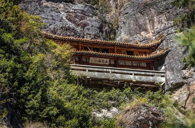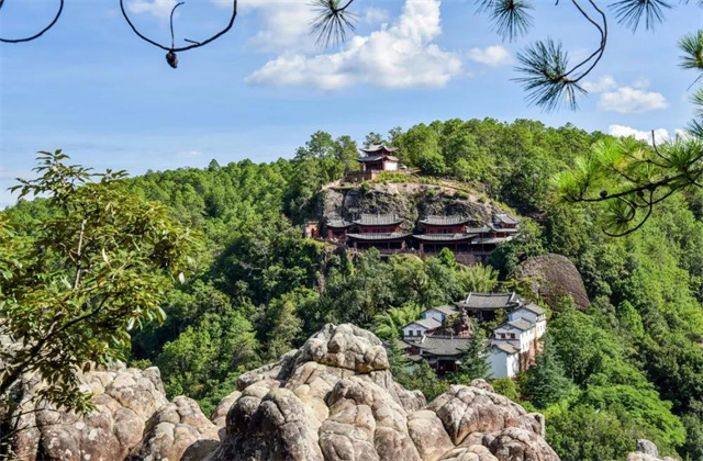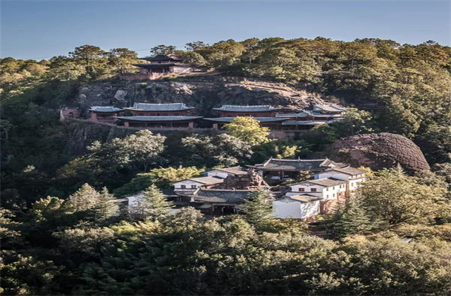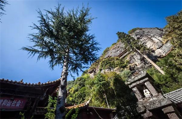 這里有千年古剎賢林禪寺寺后懸掛在峭壁半空的亭臺(tái)樓閣是滿賢林最為奇絕壯觀的古建筑群石壁上有一棵巨柏拔地沖天“擎天”是對(duì)這棵“倚天”沖霄柏的絕妙寫照