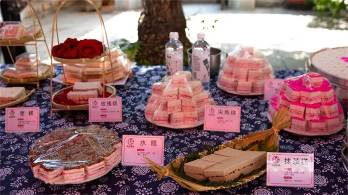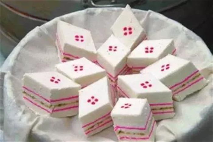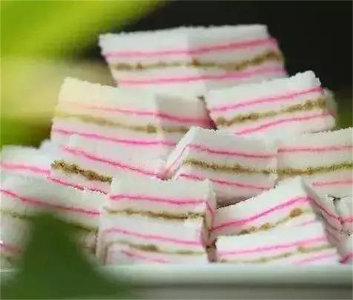 色糕呈正方形,中間有紅色腰線,表面為紅色罩面,紅白分明,質(zhì)細(xì)而美觀。