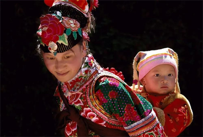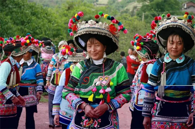 基本款式以黑、紅、藍、綠為主色調(diào),刺繡工藝精湛,圖案變化多樣,飾物靚麗華貴。在東山、大倉一帶的彝族女子服飾中,可見留存的南詔王族遺風。